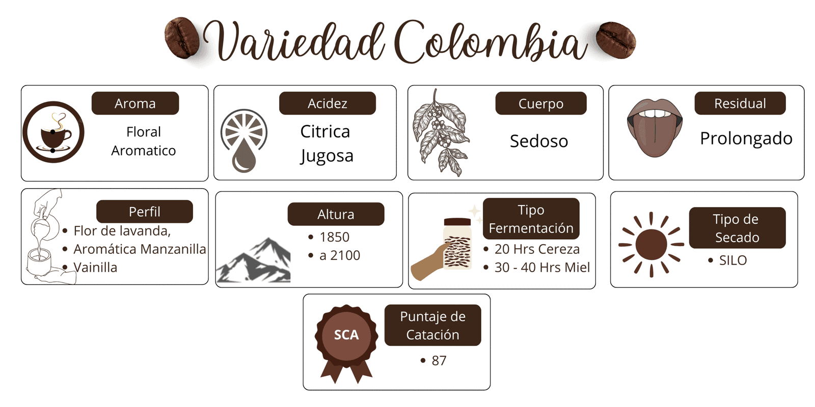 Su perfil sensorial se distingue por un aroma floral y fragante, con delicadas notas a caramelo, frutos rojos, vainilla y un sutil toque de chocolate blanco, que juntos crean una experiencia refinada y envolvente. En taza, se revela como un café limpio, elegante y con un residual prolongado que conquista incluso a los paladares más exigentes.